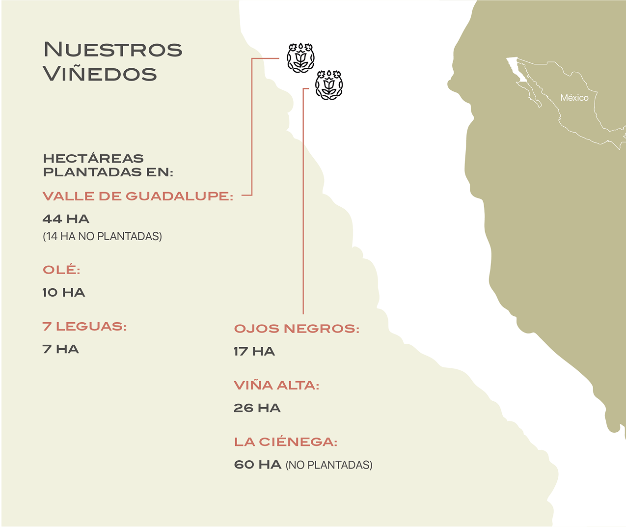 EL VALLE DE GUADALUPE, EN BAJA CALIFORNIA, ES EL CORAZÓN QUE DEFINE EL CARÁCTER DE NUESTROS VINOS. ESTA REGIÓN ESTÁ UBICADA DENTRO DE LA FRANJA MUNDIAL DE PAÍSES PRODUCTORES DE VINO, SE DESTACA POR SER EL PRINCIPAL PRODUCTOR DE VINO EN MÉXICO, GENERANDO EL 70% DE LA PRODUCCIÓN NACIONAL.